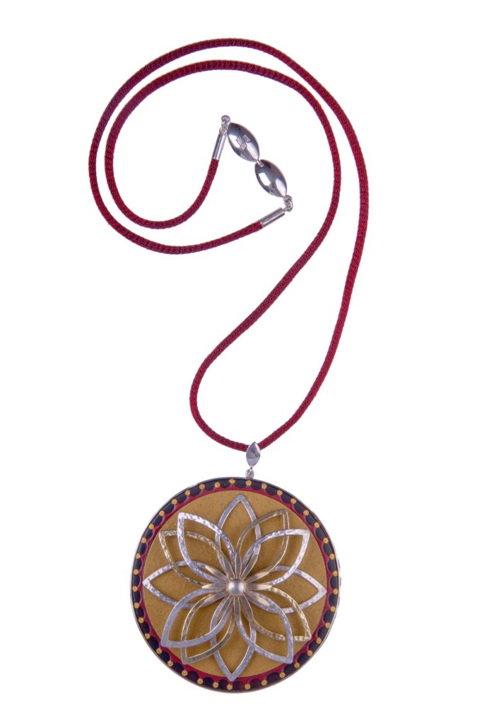 Lotuscope April 9, 2019May 13, 2019 by mavilita In Pendants em.co.9– Lotuscope, pendant, 950 silver, 24 karat gold, cow horn, mopa-mopa (Colombian natural resin), silk cord with steel mesh