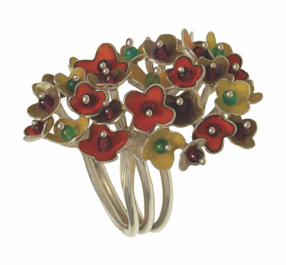 Spring Blossoms April 9, 2019May 7, 2019 by mavilita In Rings je.an.1– Spring Blossoms, ring, 950 silver, vitreous enamel, garnet, jadeite
